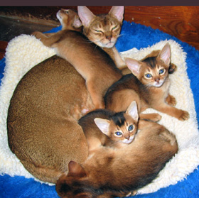 Once mobile, i.e. their paws and legs begin to act in coordination, they quickly begin to scamper about. We and their mom limit how far they can travel. They don't know about feet and closing doors yet and they are too small to find out. At 8 weeks old they really start to explore and are allowed to introduce themselves to the resident Abys. It isn't always a pleasant experience for them and some need to be shown their place. Even so they are full of energy, hunger and sleep and they experience all three in abundance.
